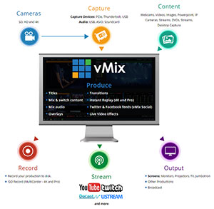 vMix is software that allows you to create professional quality productions on your own computer at a fraction of the cost. vMix gives you the power to add multiple cameras, videos, images, audio, web streams, Powerpoint, titles, virtual sets, chroma key, and much more to your production. You are then able to display, record and live stream your production all at the same time!