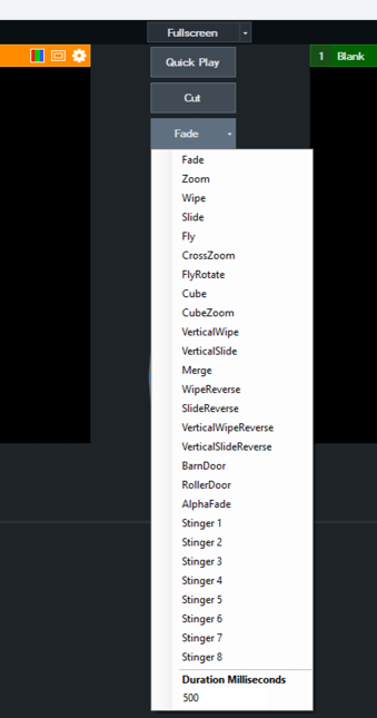 vMix provides four customisable buttons that can be used to set the transition effect when switching from Preview to Output